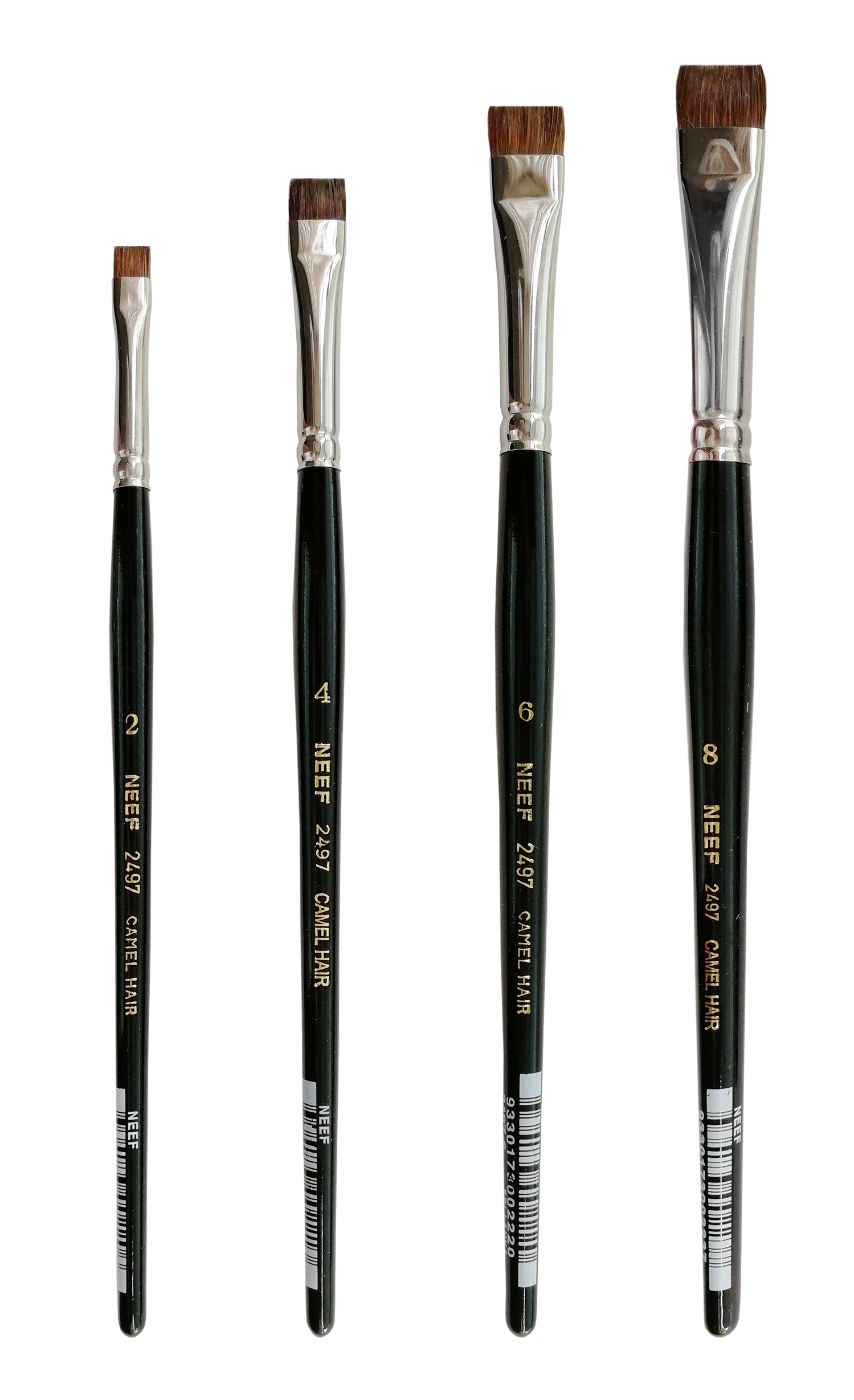 The Neef 2497 Bright Camel Hair Brush is made from a soft bodied natural fibre Camel hair. Though despite what the name suggests, Camel hair is not from Camel, but actually consist of various cheaper hair types like pony or lesser grade squirrel hair. These brushes a very bodied for a short flat brush allowing for them to hold more paint, and their shorter fibre makes for very direct precise mark making.